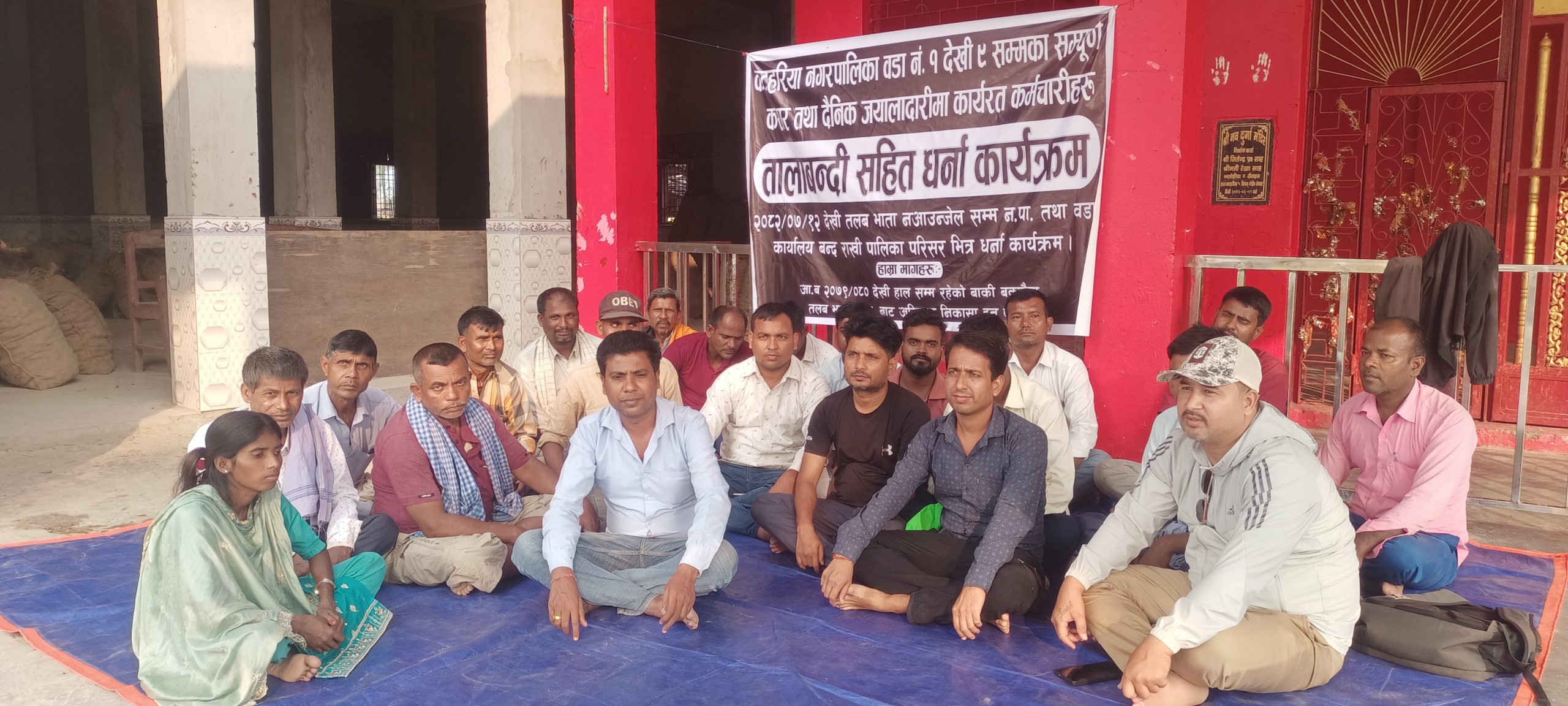 तलबभत्ता नपाएपछि असन्तुष्ट कर्मचारीहरूले वडा नं. १ देखि ९ सम्मका सबै वडा कार्यालयहरू तथा नगरपालिकाको मुख्य कार्यालयमा तालाबन्दी गर्दै कार्यालय परिसरमै धर्ना दिएका छन् ।