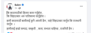 काठमाडौंको हिमा काम गर्न र नगर्ने भए सिंहदरबार नै सार्न भन्दै शाहले फेसबुकमा लेखेका छन्, ‘कि काठमाडौंको हितमा काम गर्नुहोस्, कि सिंहदरबार अरु पालिकामा सार्नुहोस् । हामी काठमाडौंवासीलाई कुनै आपत्ति छैन, चाहे सिंहदरबार सार्नुस कि राजधानी सार्नुस् । हामीलाई हाम्रो सम्पदा, संस्कृति, कला, सभ्यता चाहिन्छ , राजनीति हैन ।’