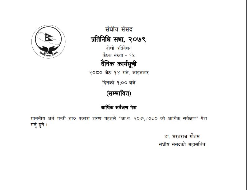 आजको बैठकमा अर्थमन्त्री प्रकाशशरण महतले ‘आब २०७९÷८०को आर्थिक सर्बेक्षण पेश गर्ने सम्भावित कार्यसुचीमा उल्लेख छ ।