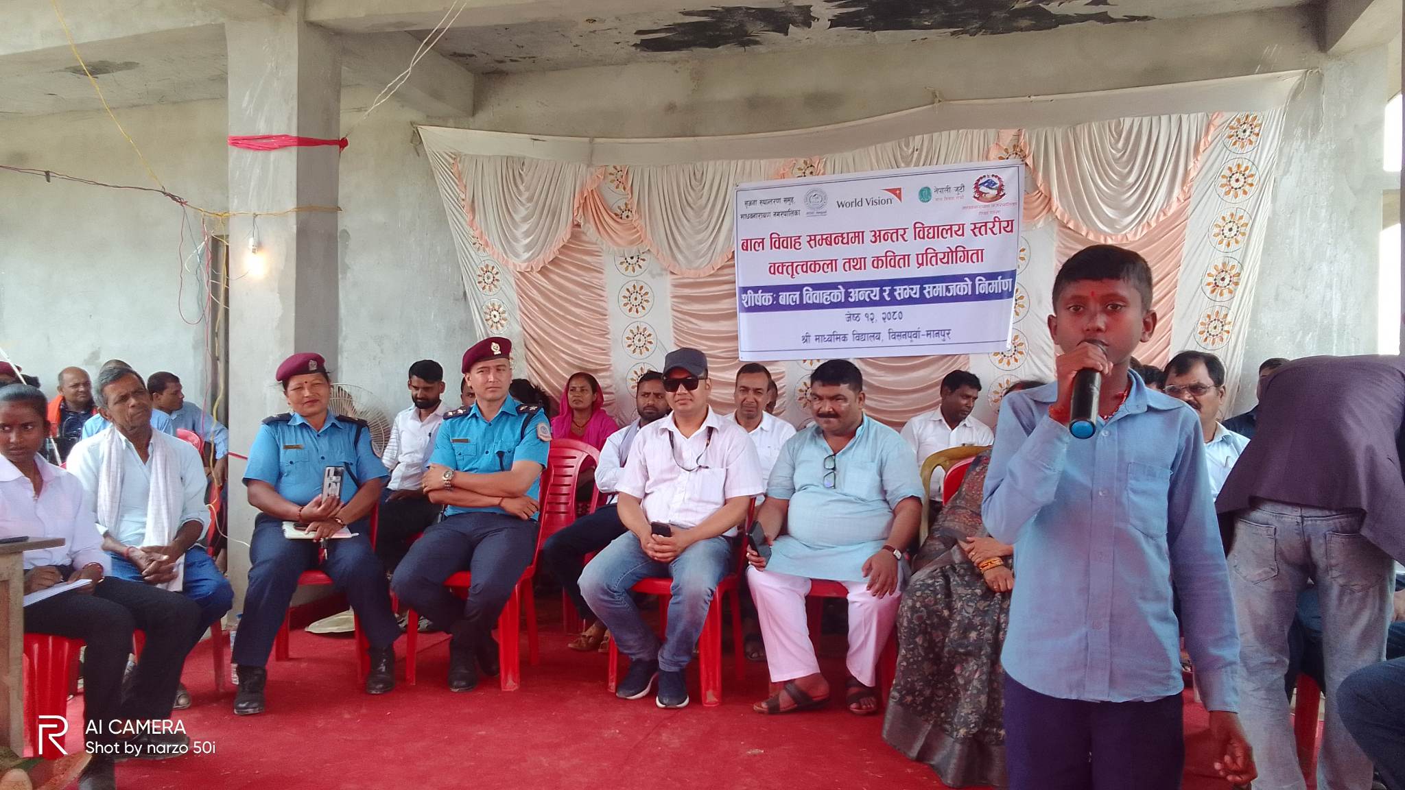 रौतहटको माधवनारायण नगरपालिकामा अवस्थित श्री माध्यमिक विद्यालय बिशुनपूर्वा मानपुरको प्राङ्गणमा वर्ल्ड भिजन इन्टरनेसनल नेपाल , आर्डिसी नेपाल , श्रृजना रूपान्तरण समुह माधवनारायण नगरपालिका र माधवनारायण नगरपालिकाको सहकार्यमा आयोजना गरिएको नगर स्तरीय “बाल विवाह अन्तर विद्यालय स्तरीय वक्तृत्वकला तथा कविता प्रतियोगिता ” मा विभिन्न विद्यालयका विद्यार्थीहरूको सहभागितामा भव्य रूपमा सम्पन्न भएको छ । उक्त नगर स्तरीय वक्तृत्वकला तथा कविता प्रतियोगिता श्रृजना रूपान्तरण समुह माधवनारायण नगरपालिकाकी अध्यक्ष अनिशा कुमारी शर्माको अध्यक्षतामा सञ्चालन गरिएको प्रतिस्पर्धा कार्यक्रममा माधवनारायण नगरपालिका भरिकै १२ वटा विद्यालयका छात्र छात्राहरु सहभागी भएका थिए ।