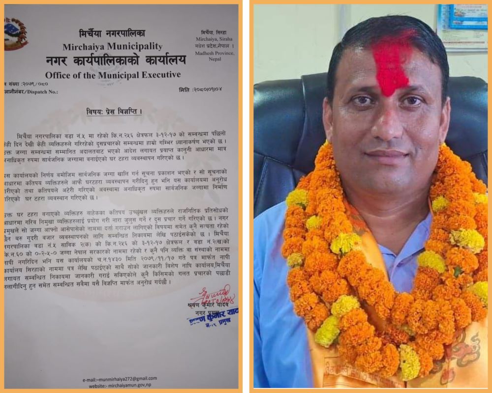 ‘मिर्चैया नगरपालिका ५ साविक २ क को कित्ता नम्बर २५६ को ३–१२–१७ क्षेत्रपफ्ल र वडा नम्बर २ ख को कित्ता नम्बर ६० को ०–२–५–० जग्गा नेपाल सरकारको नाममा रहेको र कुनै पनि व्यक्ति वा संस्थाको नाममा नापी नगरिदिन भनी नगरले नापी कार्यालय सिरहाको नाममा पत्र लेखी पठाइएको साथै सो को जानकारी विशेष नापी कार्यालय मिर्चैया लगायत सम्बन्धित निकायमा जानकारी गराईसकेकोले कुनै किसिमको गलत प्रचारको पछाडि नलागिदिनुहुन नगरले अनुरोध गरिएको छ,’ जारी विज्ञप्तिमा भनिएकाे छ ।