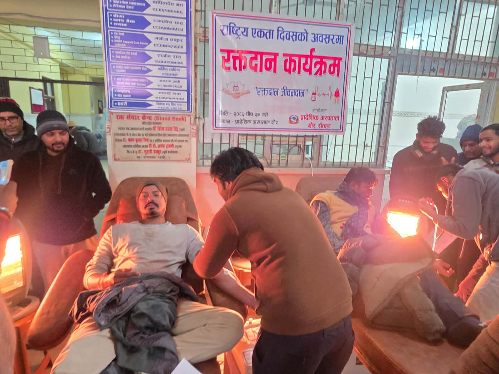 गाैर । राष्ट्रिय एकता दिवसको अवसरमा रौतहट जिल्लाको सदरमुकाम गौरस्थित प्रादेशिक अस्पताल गौरमा रक्तदान कार्यक्रम भव्य रूपमा सम्पन्न भएको छ । अस्पतालका अध्यक्ष अवधेश यादवको सक्रियतामा आयोजित उक्त कार्यक्रम अस्पताल प्रशासनको समन्वयमा विभिन्न सामाजिक संघ–संस्था, स्वास्थ्यकर्मी तथा स्थानीय युवाहरूको उल्लेखनीय सहभागितामा सम्पन्न भएको हो ।