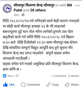विद्युत् सेवा अवरुद्ध हुँदा उपभोक्तालाई केही असुविधा पर्न सक्ने भएकाले मौलापुर वितरण केन्द्रले सबै ग्राहक वर्गमा क्षमायाचना गर्दै आवश्यक वैकल्पिक व्यवस्था मिलाउन अनुरोध गरेको छ ।