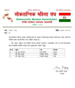 बैठकले लोकतान्त्रिक महिला संघको संशोधित विधानअनुसार धनुषाकी अन्नु महासेठलाई सह-सचिव,धनुषाकै मिना ठाकुर र पर्साकी ज्याेती पटेललाई केन्द्रीय सदस्यमा मनोनयन गरेको छ ।