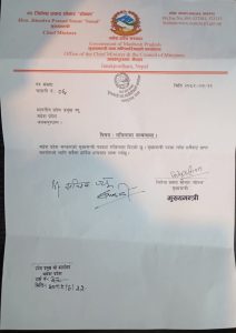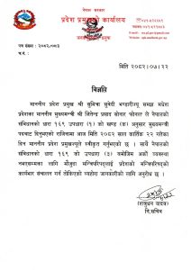 विज्ञप्तिमा भनिएको छ, “नेपालको संविधानको धारा १६९ को उपधारा (३) बमोजिम अर्को व्यवस्था नभएसम्मका लागि मौजुदा मन्त्रिपरिषद्लाई प्रदेशको मन्त्रिपरिषद्को कार्यभार सञ्चालन गर्न तोकिएको छ।”