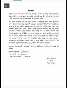 पोस्टमार्फत टेलिकमले इन्टरनेट सेवा नचलेमा वा समस्या भएमा नमस्ते वाई-फाई (नमस्ते वाई-फाई/डब्लूबीबी डिभाइस) सेवाका ग्राहकले नमस्ते वाई-फाई सेवाको राउटर अफ गरेर अन गर्न आग्रह गरेको हो ।