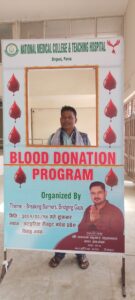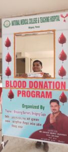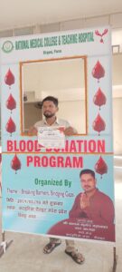 साे रक्तदान कार्यक्रममा नेसनल मेडिकल कलेज एण्ड टिचिङ हस्पिटल बीरगंज पर्साकाे ब्लड बैंककाे टिमले सहयोग रहेको थियो ।