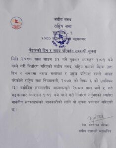‘राष्ट्रियसभाको बैठक उक्त दिन र समयमा नराख सत्तापक्ष र प्रमुख प्रतिपक्ष दलले आग्रह गरेकोले राष्ट्रियसभा नियमावली, २०७५ को नियम ६ को उपनियम (३) बमोजिम सम्माननीय अध्यक्षज्यूले २०८० साल भदौ ५ गते मङ्गलबार अपराह्न १ः०१ बजे बस्ने गरी निर्धारण गर्नुभएको ब्यहोरा माननीय सदस्यहरूको जानकारीको लागि यो सूचना प्रकाशन गरिएको छ,’ जारी सूचनामा उल्लेख छ ।
