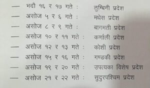 बैठकले १६ र १७ भदाैमा लुुम्बिनी प्रदेशको, ५ र ६ असोजमा मधेस प्रदेश, ८ र ९ बागमती प्रदेश, १० र ११ असोजमा कर्णाली प्रदेशको, १२ र १३ असोजमा कोशीको, १५ र १६ गण्डकीको, १९ र २० असोजमा उपत्यका विशेष प्रदेशको र २१ २२ असोजमा सुदूरपश्चिम प्रदेशको अधिवेशन गर्ने निर्णय गरेको पार्टी सचिव योगेश भट्टराईले जानकारी दि ।