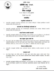 आजको प्रतिनिधिसभा बैठकमा राष्ट्रपति कार्यालयबाट प्राप्त कार्यभार तोकिएको र बिद्येयक प्रमाणीकरण सबन्धी पत्रहरुको ब्योहोरा पढेर सुनाउने तथा प्रधानमन्त्री तथा मन्त्रीपरिषद कार्यालयवाट प्राप्त कार्यभार तोकिएको पत्र पढेर सुनाइनेछ ।