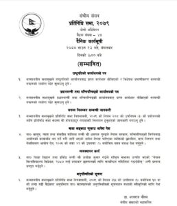 आजको प्रतिनिधिसभा बैठकमा राष्ट्रपति कार्यालयबाट प्राप्त कार्यभार तोकिएको र बिद्येयक प्रमाणीकरण सबन्धी पत्रहरुको ब्योहोरा पढेर सुनाउने तथा प्रधानमन्त्री तथा मन्त्रीपरिषद कार्यालयवाट प्राप्त कार्यभार तोकिएको पत्र पढेर सुनाइनेछ ।