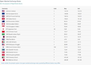नेपाल राष्ट्र बैंकका अनुसार आज अमेरिकन डलरको खरिद दर १३२ रूपैयाँ १० पैसा र बिक्री दर १३२ रूपैयाँ ७० पैसा तथा युराेपियन युरो एकको खरिद दर १४४ रूपैयाँ ९५ पैसा र बिक्री दर १४५ रूपैयाँ ६१ पैसा कायम गरिएकाे छ ।