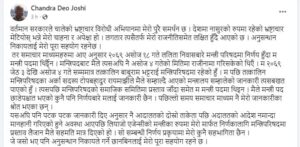 ललिता निवास जग्गा हिनामिना प्रकरणमा आफूविरुद्ध पक्राउ पुर्जी जारी भएपछि पूर्वमन्त्री चन्द्रदेव जोशीले सरकारको भ्रष्टाचार विरोधी अभियानमा आफ्नो पूरा समर्थन रहेको बताएका छन् ।