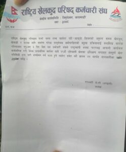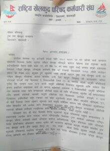 राष्ट्रिय खेलकुद परिषदमा ’लामो समयसम्म कार्यरत रही आफ्नो जीवनको अमुल्य समय खेलकुद, खेलाडी र देशका लागि समर्पण गरेका राष्ट्रसेवक कर्मचारीहरुको बढुवा प्रक्रियालाई यथाशीघ्र सार्थक परिणाममा नपुर्याए ३ दिनभित्र यस कर्मचारी संघले राष्ट्रव्यापी रुपमा चरणबद्व आफनो कार्यक्रम सार्वजनिक गरी दैनिक प्रशासनिक कार्यका साथै १९ औं एसियाली खेलका प्रशिक्षण लगायत सम्पूर्ण खेल गतिविधि ठप्प पारी आन्दोलन गर्न बाध्य हुने व्यहोरासमेत यसै ज्ञापन पत्र मार्फत जानकारीका लाि अनुरोध गर्दछ ।