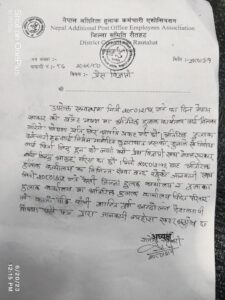 नेपाल अतिरिक्त हुलाक कर्मचारी एसोसिएसनका जिल्ला अध्यक्ष चौधरीले सरकारले अतिरिक्त हुला कार्यालय खारेजीको निर्णय तत्काल फिर्ता लिनु पर्ने बताउनु भयो ।