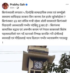 ‘वीरगंजवासी लगातार ५ दिनदेखि साम्प्रदायिक तनाव एवं कफ्र्यूको सकसमा बाचिरहदा सरकार किन कानमा तेल हालेर सुतेकोहोला ? वीरगंजबाट ३÷३ वटा संघिय मन्त्री रहेका ओली सरकारले वीरगंजको पिड़ादायी अवस्थाप्रति गम्भीर नदेखिनु दुःखद हो,’ आजपा अध्यक्ष साहले लेखेका छन् ।
